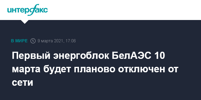 Москва. 9 марта. INTERFAX.RU - Первый энергоблок БелАЭС 10 марта будет в соответствии с планом отключен от сети, говорится в официальном телеграм-канале Минэнерго Белоруссии во вторник.