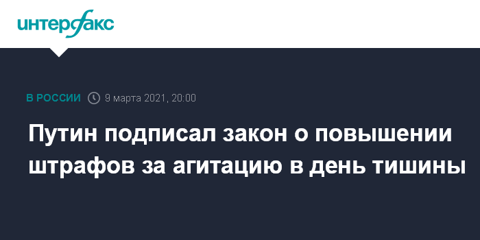 Москва. 9 марта. INTERFAX.RU - Президент России Владимир Путин подписал закон, по которому в России существенно увеличиваются штрафы за предвыборную агитацию в запрещенных местах и в день тишины.