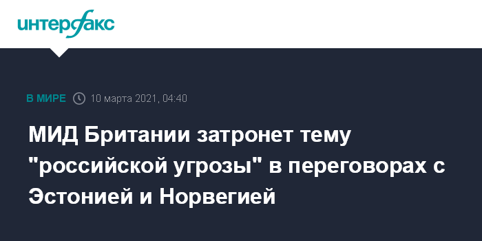 Москва. 10 марта. INTERFAX.RU - Министр иностранных дел Великобритании Доминик Рааб намерен во время визитов в Эстонию и Норвегию поднять вопросы "угрозы, исходящей от России", сообщил британский МИД.
