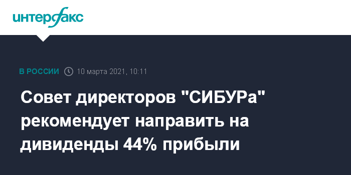 Совет директоров "СИБУРа" рекомендует направить на дивиденды 44% прибыли