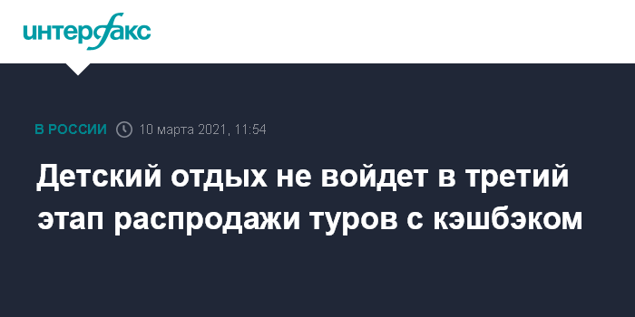 Москва. 10 марта. INTERFAX.RU - Путешествия для детей не будут включены в третий этап распродажи туров по России с кэшбэком из-за вопросов, связанных с безопасностью детей во время поездок и санитарно-эпидемиологических ограничений, сообщила в среду начальник управления государственных туристских проектов и безопасности туризма Ростуризма Елена Лысенкова.