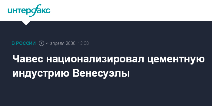 Каракас. 4 апреля. INTERFAX.RU - Президент Венесуэлы Уго Чавес заявил о проведении немедленной национализации отрасли по производству цемента. В телевизионном обращении он сказал, что его правительство не может более терпеть то, как частные компании экспортируют цемент, который крайне необходим самой Венесуэле, испытывающей острую нехватку жилья.