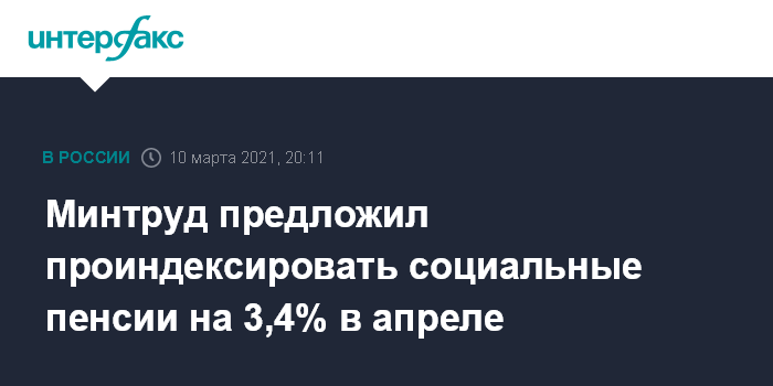 Москва. 10 марта. INTERFAX.RU - Минтруд России предлагает с 1 апреля проиндексировать социальные пенсии на 3,4%, соответствующий проект ведомством опубликован на федеральном портале проектов нормативных актов, сообщила пресс-служба ведомства в среду.