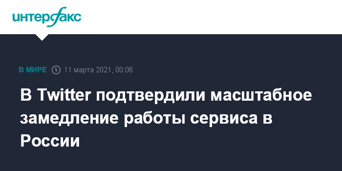 Москва. 11 марта. INTERFAX.RU - Twitter известно о намеренном замедлении работы сервиса на территории России, представитель компании назвал ограничение функционирования соцсети широкомасштабным и неизбирательным, передает газета The Wall Street Journal.
