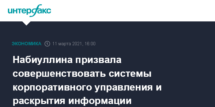 Набиуллина призвала совершенствовать системы корпоративного управления и раскрытия информации