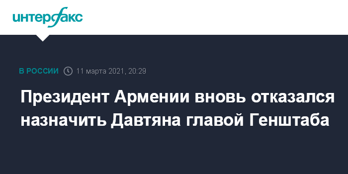 Москва. 11 марта. INTERFAX.RU - Президент Армении Армен Саркисян во второй раз не подписал предложение премьер-министра республики Никола Пашиняна о назначении Артака Давтяна на должность начальника Главного штаба Вооруженных сил.