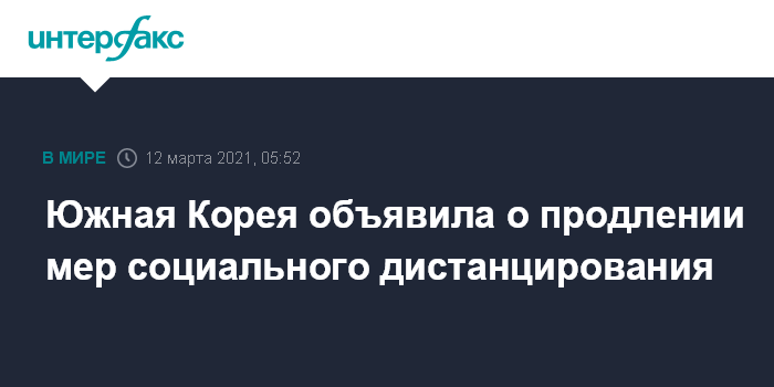 Москва. 12 марта. INTERFAX.RU - Южная Корея продлит имеющиеся меры социального дистанцирования еще на 14 дней, заявил премьер-министр Чон Се Гюн в пятницу.