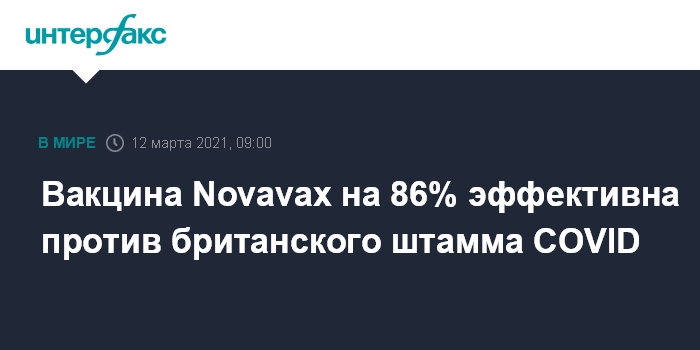 Москва. 12 марта. INTERFAX.RU - Вакцина американской Novavax на 96% эффективна в предотвращении случаев, вызванных первоначальной версией коронавируса, и на 86% - в случае с британским вариантом COVID-19, следует из данных третьей фазы испытания препарата в Великобритании, распространенных компанией.