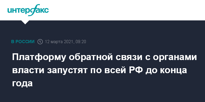 Москва. 12 марта. INTERFAX.RU - Платформа обратной связи (ПОС) "Госуслуги. Решаем вместе", которая создается по поручению президента России Владимира Путина, до конца 2021 года будет внедрена во всех субъектах РФ, региональных и муниципальных органах власти, а также в ряде федеральных органов исполнительной власти.