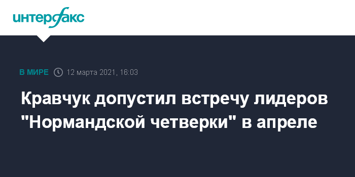 Москва. 12 марта. INTERFAX.RU - Следующая встреча лидеров стран "Нормандской четверки" (Украина, Франция, Германия, Россия) может состояться уже в апреле, однако точно говорить о ее проведении рано, заявил глава украинской делегации в Трехсторонней контактной группе по урегулированию конфликта в Донбассе (ТКГ) Леонид Кравчук в пятницу.