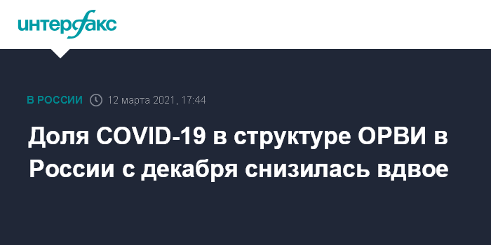 Москва. 12 марта. INTERFAX.RU - Доля COVID-19 в структуре острых респираторных вирусных инфекций в России продолжается снижаться и сегодня составляет половину от показателей декабря-января, следует из еженедельного бюллетеня НИИ гриппа имени Смородинцева Минздрава РФ.