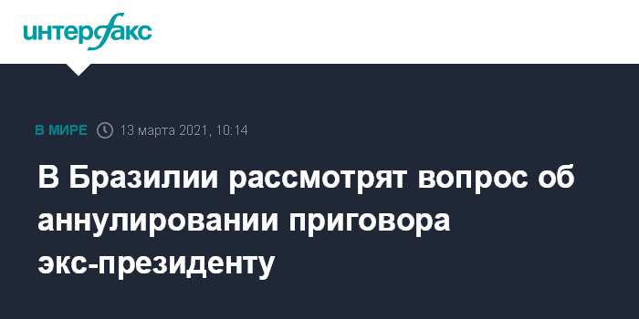 Москва. 13 марта. INTERFAX.RU - Верховный суд Бразилии в полном составе рассмотрит вопрос об аннулировании приговора экс-президенту Луису Инасиу Луле да Силве, что вновь открывает ему дорогу в политику, в частности, на выборы 2022 года, пишут в субботу бразильские СМИ.