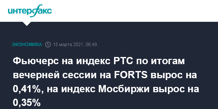 Москва. 15 марта. INTERFAX.RU - Мартовский фьючерсный контракт на индекс РТС по итогам вечерней торговой сессии на FORTS, закончившейся в 23:50 мск 12 марта, вырос на 0,41% по отношению к закрытию основной торговой сессии (18:50 мск), фьючерс на индекс Мосбиржи вырос на 0,35%.