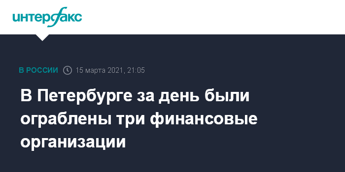Москва. 15 марта. INTERFAX.RU - Три вооруженных нападения на финансовые организации произошло в Петербурге в понедельник, следует из данных пресс-службы регионального главка МВД.