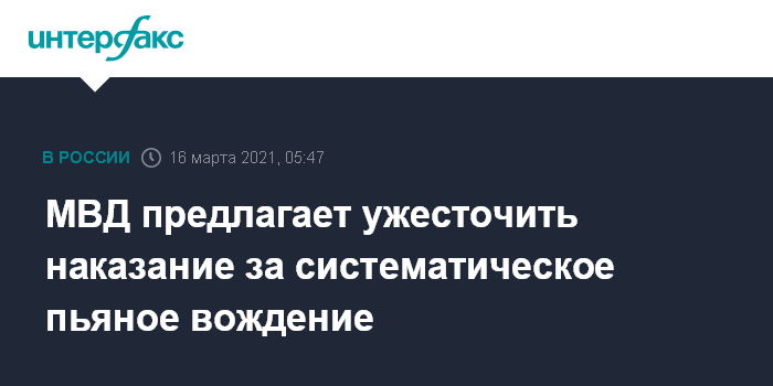 Москва. 16 марта. INTERFAX.RU - Максимальный срок лишения свободы за систематическое вождение в нетрезвом состоянии будет увеличен с двух до трех лет, соответствующие поправки в УК РФ разработало МВД России по поручению вице-премьера Юрия Борисова, сообщает газета "Коммерсант" со ссылкой на документ.