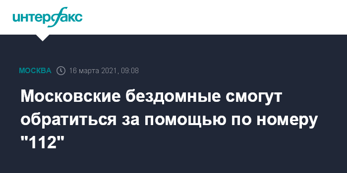 Москва. 16 марта. INTERFAX.RU - В Москве бездомные теперь могут обратиться за помощью, позвонив по единому номеру экстренных служб "112", сообщила заммэра города Анастасия Ракова.