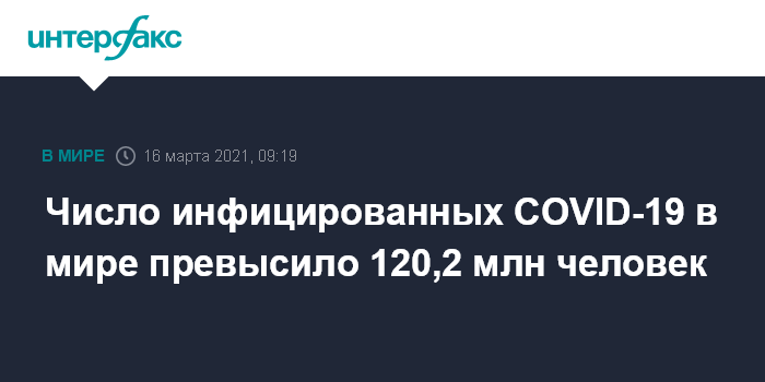 Москва. 16 марта. INTERFAX.RU - Число выявленных заражений коронавирусом в мире с начала пандемии на утро вторника составило 120 217 175, свидетельствуют данные американского университета Джонса Хопкинса.