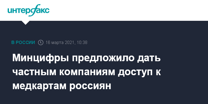 Москва. 16 марта. INTERFAX.RU - В рамках мер по поддержке российской IT-отрасли и цифровизации медицины Минцифры предложило дать частным компаниям - поставщикам электронных медсервисов - доступ к массивам данных о здоровье граждан, которые хранятся в государственных информационных системах, пишет "Коммерсантъ". Данные будут предоставляться без согласия граждан.
