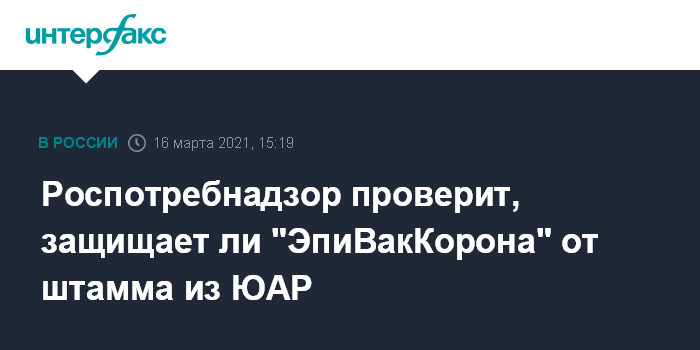 Москва. 16 марта. INTERFAX.RU - В Роспотребнадзоре сообщили, что решили проверить эффективность вакцины от коронавируса "ЭпиВакКорона", созданной в научном центре "Вектор", от южноафриканского штамма. Речь идет об экспериментах, которые определят эффективность сыворотки привитых людей в отношении этой мутации вируса.
