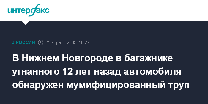 Москва. 21 апреля. INTERFAX.RU - В бесхозном гараже на территории Сормовского района Нижнего Новгорода в понедельник был обнаружен угнанный 12 лет назад автомобиль, в багажнике которого находился мумифицированный труп мужчины.
