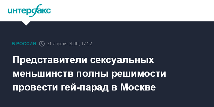 Москва. 21 апреля. INTERFAX.RU - Организаторы гей-парада намерены провести это мероприятие в Москве в день, когда состоится финал конкурса "Евровидение", даже если столичные власти не дадут разрешения на акцию. "Мы выйдем на улицы Москвы, чтобы реализовать свое конституционное право на свободу мирных собраний вне зависимости от решения столичных властей", - заявил организатор гей-парада Николай Алексеев во вторник журналистам.