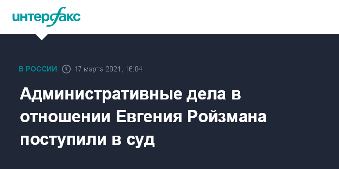 Москва. 17 марта. INTERFAX.RU - Материалы дел об административных правонарушениях в отношении бывшего мэра Екатеринбурга Евгения Ройзмана в среду поступили в Октябрьский районный суд города.