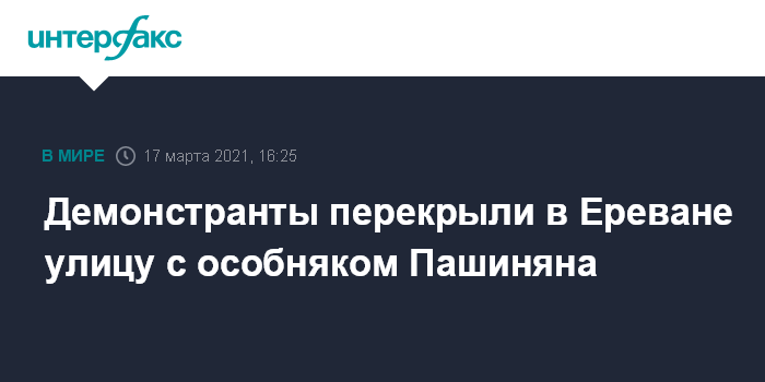 Москва. 17 марта. INTERFAX.RU - Требующие отставки премьер-министра Армении Никола Пашиняна активисты оппозиционного движения "Азатагрум" (Освобождение) перекрыли улицу Прошяна в центре Еревана.