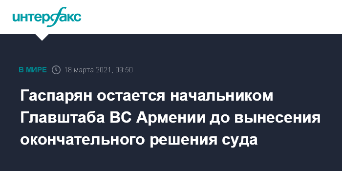 Москва. 18 марта. INTERFAX.RU - Административный суд Армении вынес решение по иску бывшего начальника Главного штаба ВС Оника Гаспаряна, оспаривающего законность его освобождении от должности, приняв обеспечительные меры.