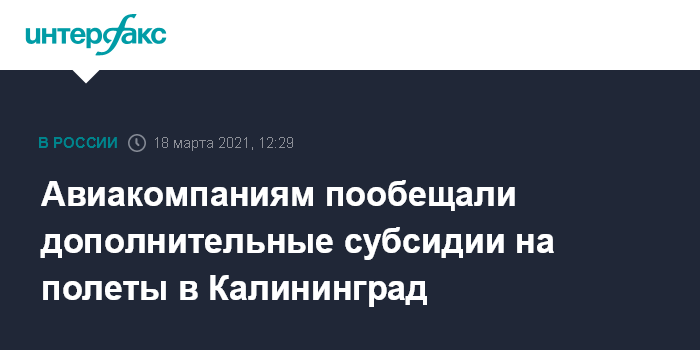 Москва. 18 марта. INTERFAX.RU - Правительство выделит дополнительные субсидии для авиакомпаний, выполняющих полеты в Калининград, сообщил в инстаграме губернатор региона Антон Алиханов. Он перечислил результаты переговоров с главой федерального Минтранса Виталием Савельевым.