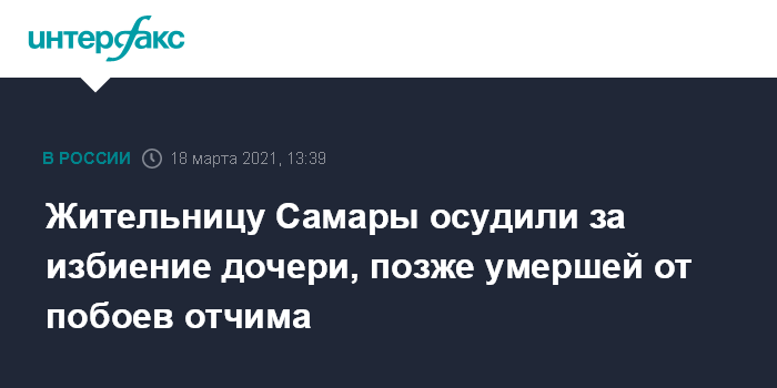 Москва. 18 марта. INTERFAX.RU - Автозаводской суд Тольятти приговорил к 3 годам и 7 месяцам колонии общего режима местную жительницу, избивавшую свою двухлетнюю дочку, девочка умерла в 2019 году в результате побоев пьяного сожителя матери, сообщается на сайте генеральной прокуратуры РФ.