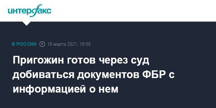 Москва. 18 марта. INTERFAX.RU - Бизнесмен Евгений Пригожин намерен опубликовать документы ФБР с информацией о нем в случае, если получит их, он готов добиваться этого в суде.