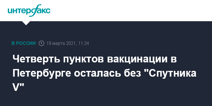 Москва. 19 марта. INTERFAX.RU - Около четверти пунктов вакцинации в Петербурге закрылись из-за отсутствия "Спутника V", но записаться на прививку еще можно в другие, а без записи вакцинироваться в торговых центрах, сообщили "Интерфаксу" в пресс-службе комитета по здравоохранению в пятницу.