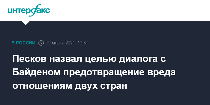 Москва. 19 марта. INTERFAX.RU - Президент РФ Владимир Путин предложил лидеру США Джо Байдену пообщаться в открытом режиме, чтобы не позволить беспрецедентным заявлениям американского президента нанести окончательный вред двусторонним отношениям, заявил его пресс-секретарь Дмитрий Песков.