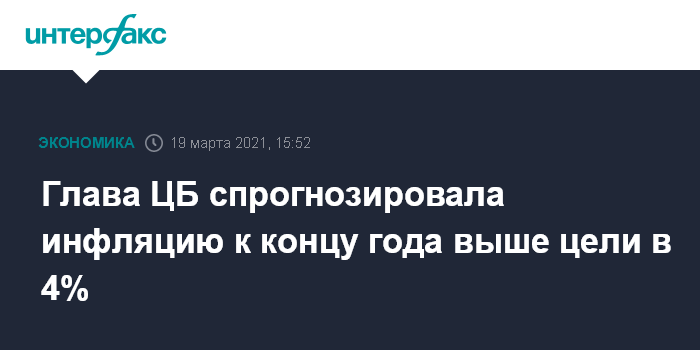 "Что касается прогноза по будущей инфляции, мы действительно его пересмотрели. Мы теперь ожидаем возвращения инфляции к нашей цели 4% в первой половине 2022 года. Что касается прогноза инфляции на конец этого года, мы его опубликуем в апреле, у нас в апреле опорное заседание, и мы будем обновлять весь прогноз, но сейчас могу сказать, что, по нашим оценкам, к концу года инфляция будет ниже текущих значений, но диапазон, скорее всего, будет выше нашей цели - выше 4%", - сказала Набиуллина.