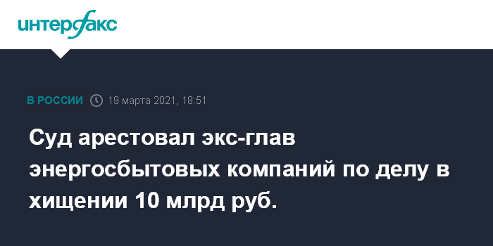 Москва. 19 марта. INTERFAX.RU - Тверской суд Москвы санкционировал арест ряда бывших руководителей региональных энергосбытовых компаний, обвиняемых в мошенничестве на сумму свыше 10 млрд рублей.
