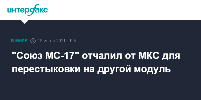 Москва. 19 марта. INTERFAX.RU - Пилотируемый корабль "Союз МС-17" успешно расстыковался с Международной космической станцией (МКС) в рамках перестыковки корабля на другой модуль, следует из трансляции "Роскосмоса".
