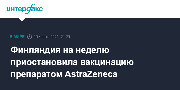 Москва. 19 марта. INTERFAX.RU - В Финляндии на неделю приостанавливается вакцинация от коронавируса препаратом AstraZeneca.