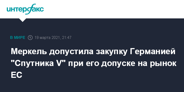 Москва. 19 марта. INTERFAX.RU - Канцлер Ангела Меркель не исключила, что ФРГ может закупить российскую вакцину от коронавируса "Спутник V" самостоятельно, если не будет достигнуто соглашение о закупках на уровне Евросоюза и при условии, что вакцина будет допущена на рынок ЕС.