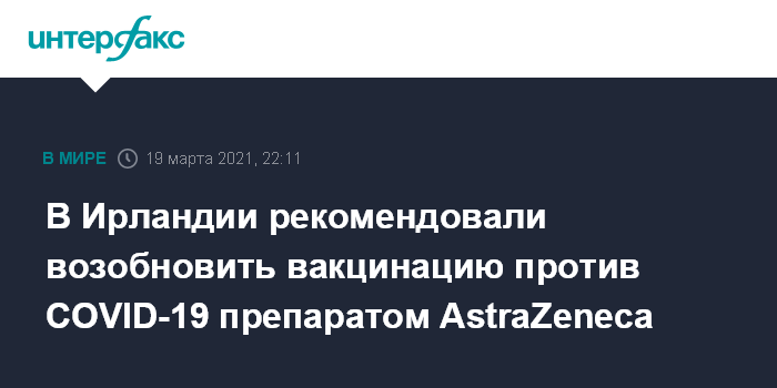 Москва. 19 марта. INTERFAX.RU - Национальный консультативный комитет по иммунизации Ирландии (NIAC) рекомендовал возобновить применение вакцины против коронавируса COVID-19 компании AstraZeneca для людей старше 18 лет.