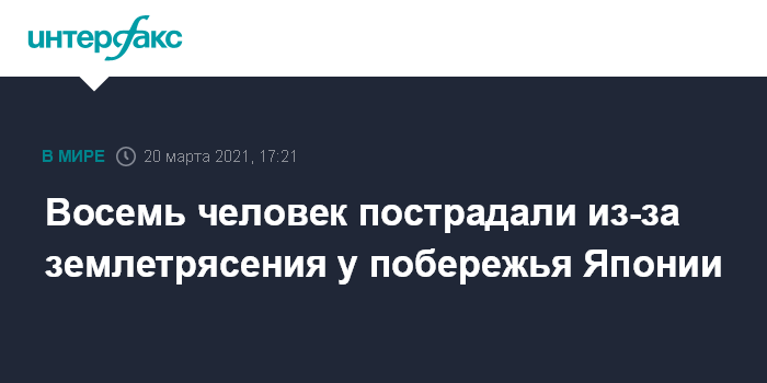 Москва. 20 марта. INTERFAX.RU - Минимум восемь человек получили травмы в японских префектурах Мияги и Иватэ в результате землетрясения магнитудой 6,9, которое произошло в субботу у северо-восточного побережья японского острова Хонсю, сообщил телеканал NHK.