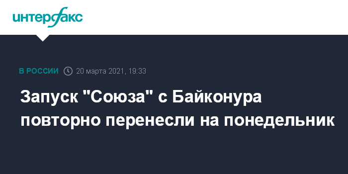 Первоначально пуск был запланирован на 20 марта, однако за 38 минут до старта в "Роскосмосе" сообщили, что он отложен на резервную дату, 21 марта. В трансляции госкорпорации уточнили, что перенос произошел по техническим причинам. Глава госкорпорации Дмитрий Рогозин сообщил, что в ракете-носителе не выявлены неисправности.