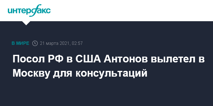 Москва. 21 марта. INTERFAX.RU - Посол РФ в Вашингтоне Анатолий Антонов вылетел из нью-йоркского аэропорта имени Джона Кеннеди в Москву, говорится в сообщении посольства в твиттере.