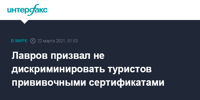 Москва. 22 марта. INTERFAX.RU - Нельзя допустить, чтобы сертификаты о вакцинации против коронавируса ущемляли принцип добровольности вакцинирования и права путешественников, заявил глава МИД РФ Сергей Лавров в интервью китайским СМИ. Расшифровка интервью была опубликована на сайте министерства.