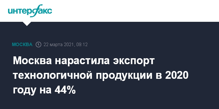 Москва. 22 марта. INTERFAX.RU - Москва в 2020 году экспортировала технологичную продукцию на $30 млрд, это на 44% больше, чем в 2012 году, сообщила заммэра столицы Наталья Сергунина.