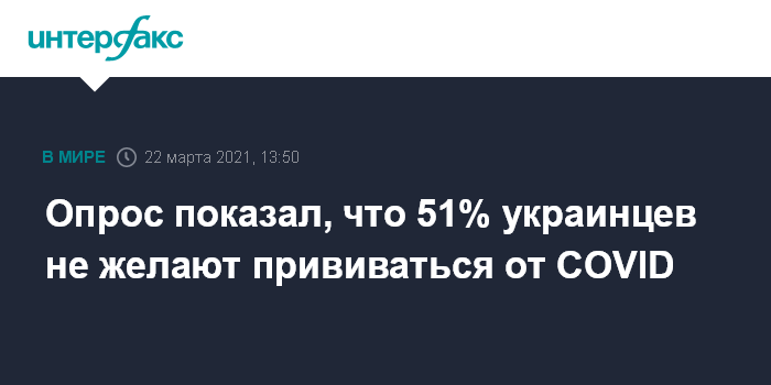 Москва. 22 марта. INTERFAX.RU - 51% украинцев готовы, не задумываясь, отказаться от вакцинации от COVID-19, и за месяц этот уровень вырос на 7%, свидетельствуют данные проведенного Украинским институтом будущего (UIF) социологического опроса, презентованные в информационном агентстве "Интерфакс-Украина" в понедельник.