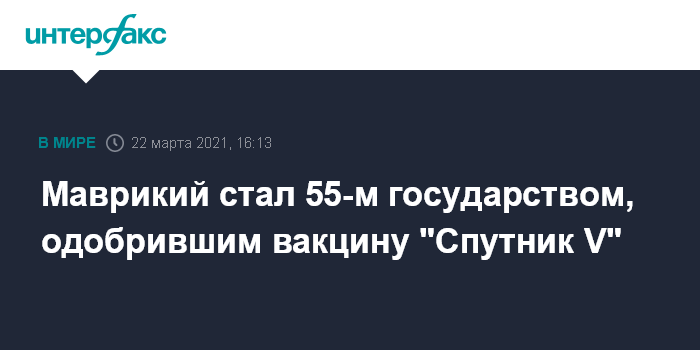 Москва. 22 марта. INTERFAX.RU - Российская вакцина "Спутник V" зарегистрирована на Маврикии, сообщает Российский фонд прямых инвестиций (РФПИ).
