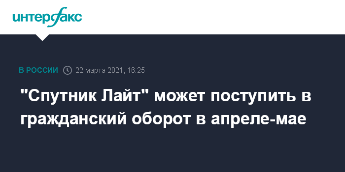 Москва. 22 марта. INTERFAX.RU - Вакцина "Спутник Лайт" может поступить в гражданский оборот в апреле-мае текущего года, сообщил председатель совета директоров компании "Р-Фарма" Алексей Репик на совещании у президента по производству вакцин.