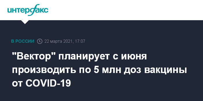 Москва. 22 марта. INTERFAX.RU - Центр "Вектор" Роспотребнадзора рассчитывает в апреле текущего года выпустить 1,5 млн доз вакцины от коронавируса "ЭпиВакКорона", в мае - 3 млн, а c июня производить 5 млн доз в месяц, заявил гендиректор центра Ринат Максютов на совещании у президента.