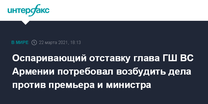 Москва. 22 марта. INTERFAX.RU - Адвокат Оника Гаспаряна, который оспаривает в судебном порядке законность его освобождения от должности начальника Главного штаба ВС Армении, подал в генпрокуратуру заявление против премьер-министра Никола Пашиняна и министра обороны Вагаршака Арутюняна в связи с назначением начальником ГШ Артака Давтяна.