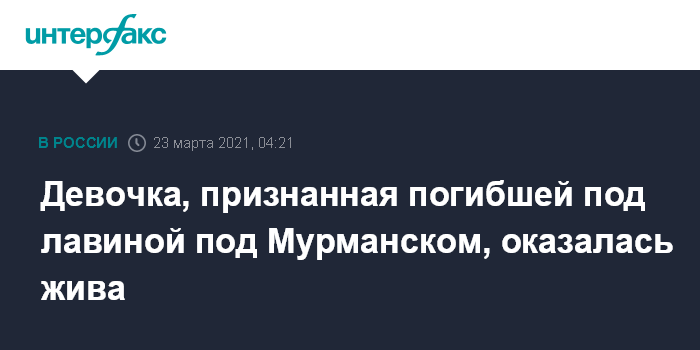 Москва. 23 марта. INTERFAX.RU - Девочка из организованной детской тургруппы из Санкт-Петербурга, которая считалась погибшей после схода снежной массы на горе Маннепахк в Мурманской области, оказалась жива, сообщили "Интерфаксу" в пресс-службе губернатора Андрея Чибиса, который в ночь на вторник выехал в Мончегорск, один из ближайших к месту происшествия городов.